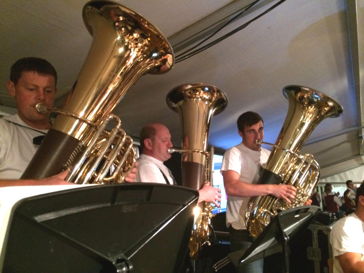 Der Einmarsch der Gastkapellen konnte noch durchgeführt werden. Leider setzte dann wieder Regen ein und der Festakt musste kurzerhand ins Festzelt verlegt werden. Wir wurden eingeladen den Dämmerschoppen musikalisch zu gestalten. Vor einem vollen Haus durften wir unser Programm zum Besten geben. Ein besonderes Highlight waren unsere 3 "d(yn)amischen" Tenöre, welche mit ihrem Dreig'sang zu Fürstenfeld und der Borsicka Polka eine Premiere feierten.